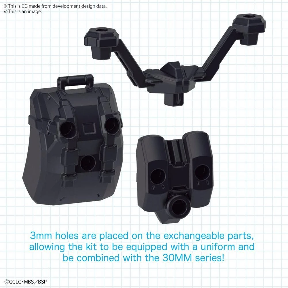 - Replacement parts are equipped with holes with a diameter of 3 mm in various places, and specifications that can be played with the 30MM series at the same time as uniforming.