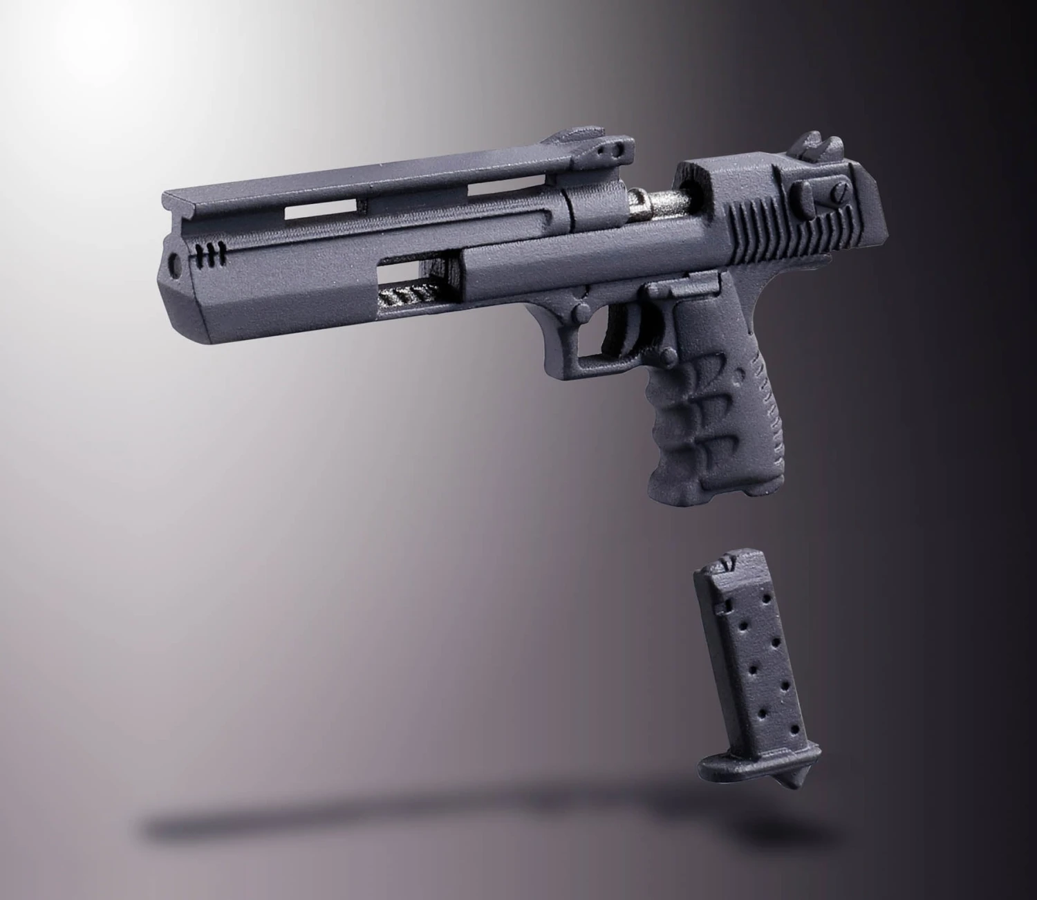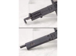 The set includes four pairs of optional hands, a Progressive Knife, a Magoroku Exterminate Sword, a Pallet Rifle, a handgun, a Pallet knife full option, an umbilical cable, a mounting joint, an optional head with goggles, shin armor, a support rod, and a display stand with cage.