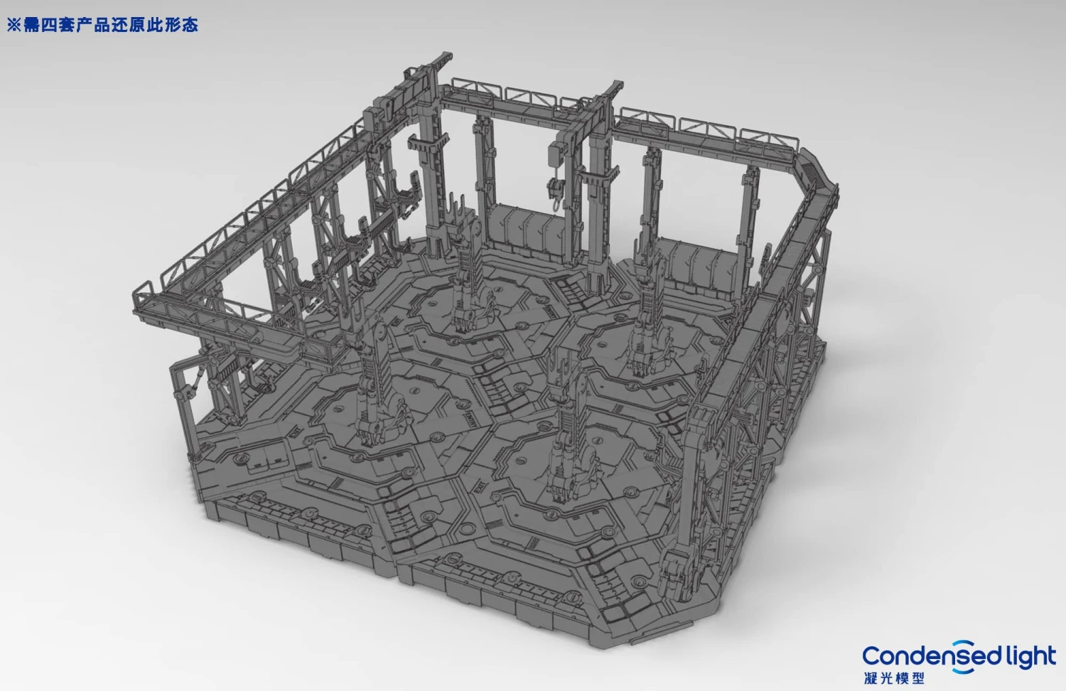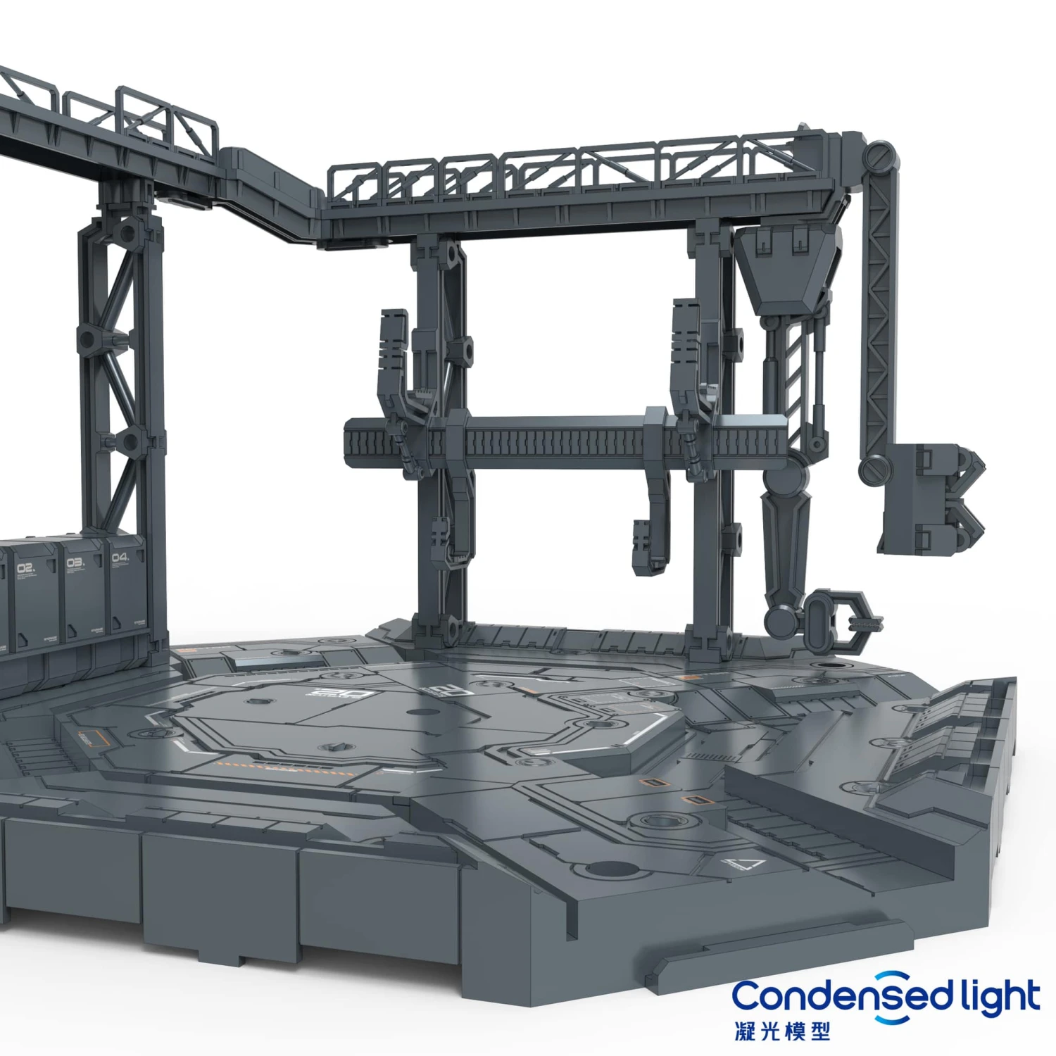 Easily customized to fit with both 1/100 and 1/144 scale kits! Set includes one section with walkways and cranes, weapon hooks, as well as two arm grips. This set also includes one set of waterslide decals for added details and customization.