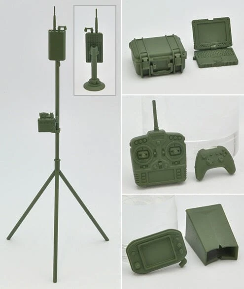 This Little Armory version comes complete with the UGV unit and a set of operation equipment. The turret can turn, and also change its elevation and depression angle; the feeder part is made of soft resin. It’s molded in three colors, and the sensor camera is also movable. The control station set includes a control antenna and short prop, a controller with hood, an equipment case and military notebook PC, and a radio/game controller. In addition to modern-day combat scenes, it also loves to play with SF mecha